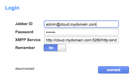 * Trying to connect to the XMPP Server using admin@cloud.h1host.ru