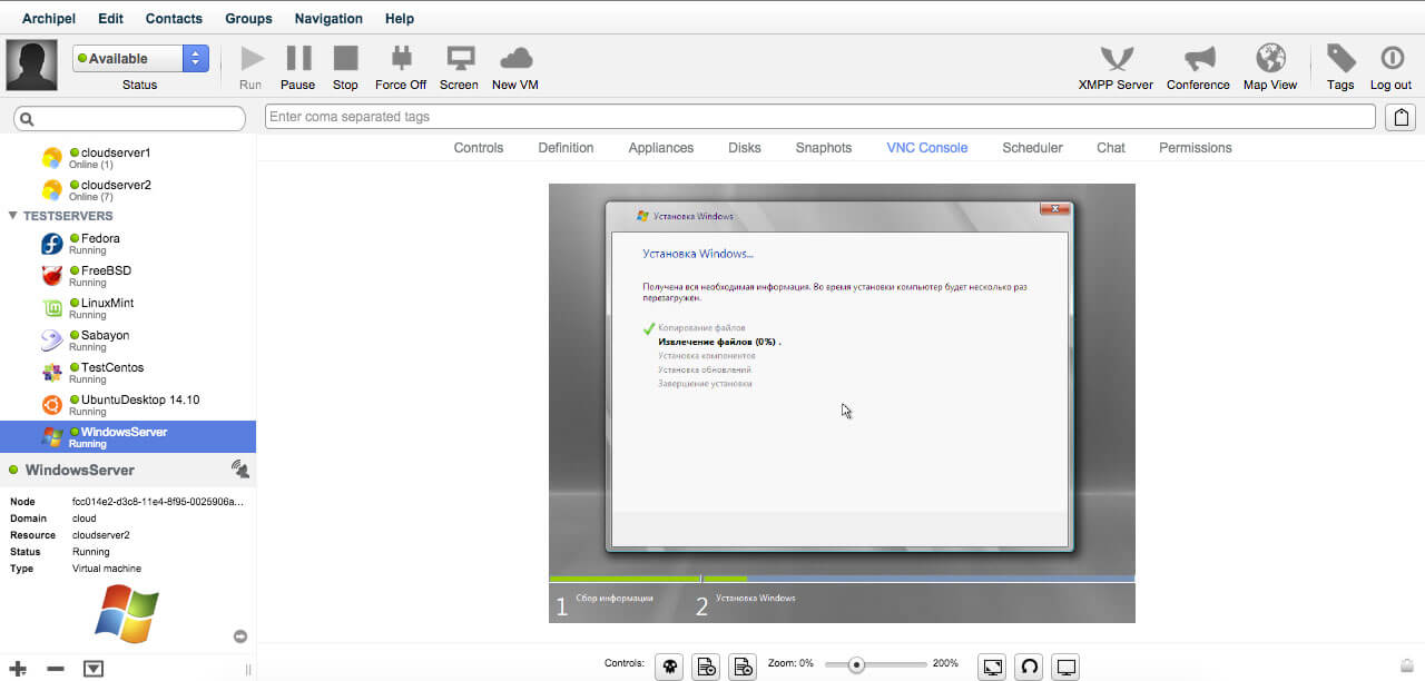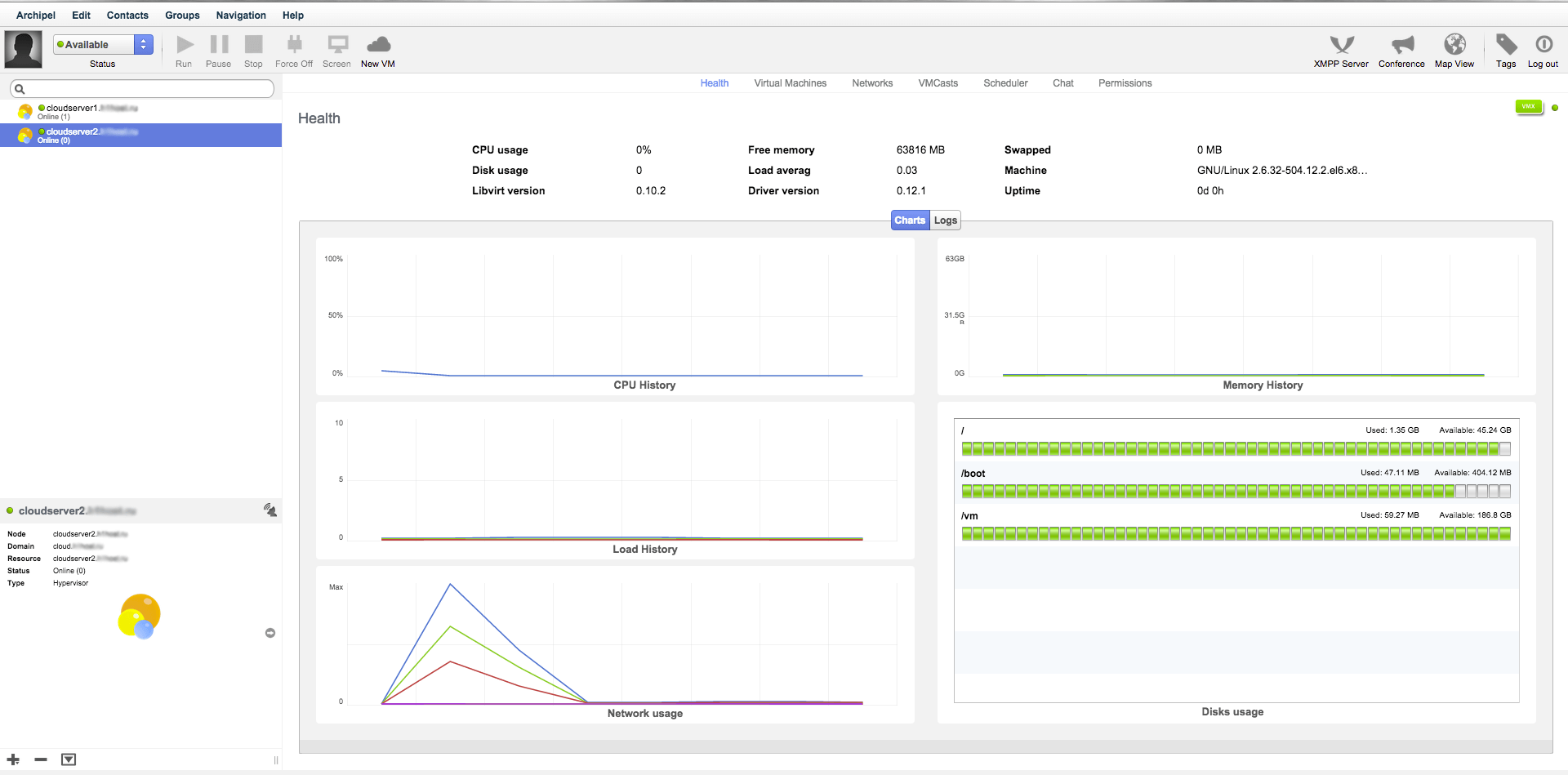 Archipel позволяет удобно управлять как несколькими виртуальными машинами на одном сервере, так и сотнями виртуалок, размещенных на десятках серверов в разных дата-цетрах.