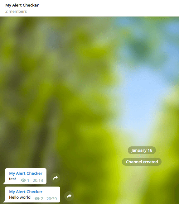1 2 3 {"ok" :true ,"result" :[{"update_id" :731268716, "channel_post" :{"message_id" :4,"chat" :{"id" :-1001348922431,"title" :"My Alert Checker" ,"type" :"channel" },"date" :1516122930,"text" :"ferfe" }}]}
