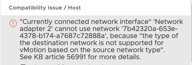 «Currently connected network interface" 'Network adapter 1' cannot use network, because "the type of the destination network is not supported for vMotion based on the source network type".